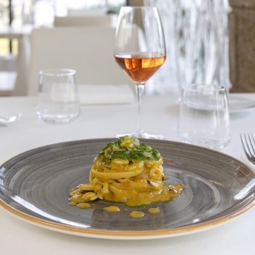 A rustic restaurant with contemporary Mediterranean-style decor surrounded by the greenery of the Sannio region, which can be admired through the large windows. Modern cuisine made from locally sourced ingredients by the owner-chef, who has vast experience working in top restaurants, both in Italy and abroad.