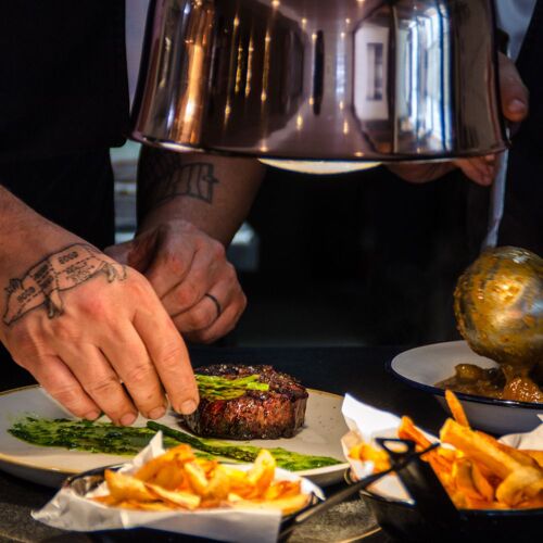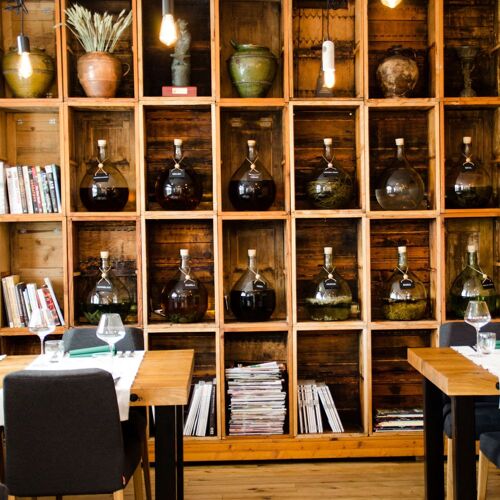 The ground floor of this restaurant is home to a café and an opulent delicatessen offering a huge selection of hams that are cured and seasoned on site – the theme continues on the first floor, where guests pass a display of hams on their way to the dining room. It soon becomes obvious that this bistro-style restaurant with a covered terrace is dedicated to local specialities such as seasoned hams, pork chops and delicious pork scratchings. The seasonal dishes include delicious brawn served with pumpkin oil and seeds, smoked prosciutto with fresh horseradish, and calf’s liver with polenta. Kodila is a real paradise for meat-lovers, with specialities that can be enjoyed without spending a fortune. The delicatessen is also worth a visit.