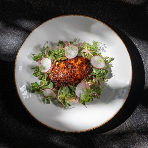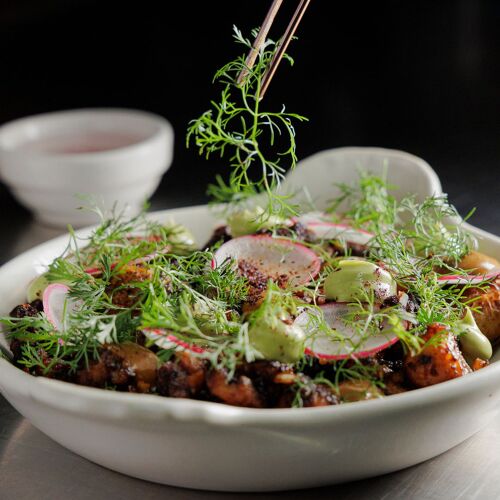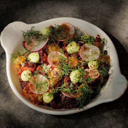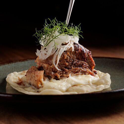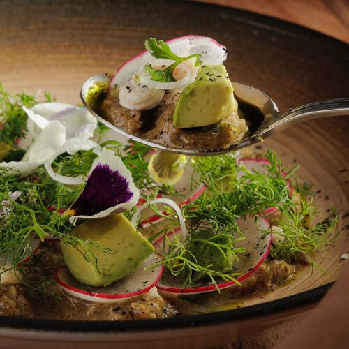 As you approach this charming spot tucked away on a small but colorful side street, the smell of the grill is the first clue you’ve arrived. Expect a large Mexican menu with a few European touches and a focus on steaks. Dialed-in executions and nuanced flavors are seen from start to finish in dishes like tostones rellenos, a savory-sweet plate of plantain dumplings in a deep, rich mole negro sauce. Steaks steal the spotlight, though main dishes still shine, as in the impossibly tender short ribs with a beer and piloncillo reduction glaze. End on a lighter note with the airy chocolate mousse with a layer of chocolate cookie crumble and fresh mint ice cream.