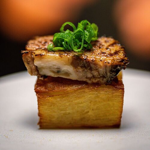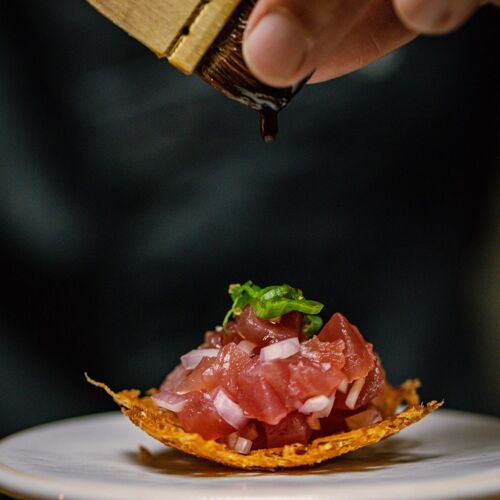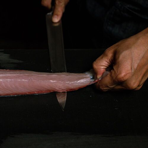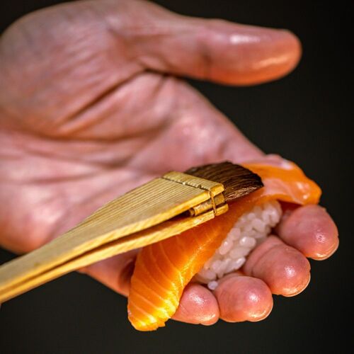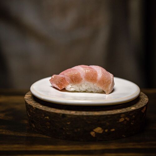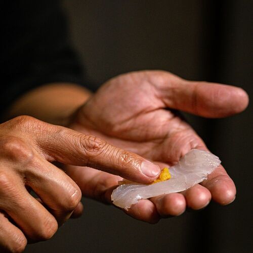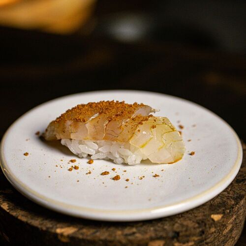 It's far from traditional nigiri; instead find whimsically embellished, playful pieces, as in a spicy margarita-inspired Japanese hamachi topped with finely diced jalapeno, grated lime zest, and sea salt; or the wagyu embellished with grated egg yolk evoking "steak and eggs."