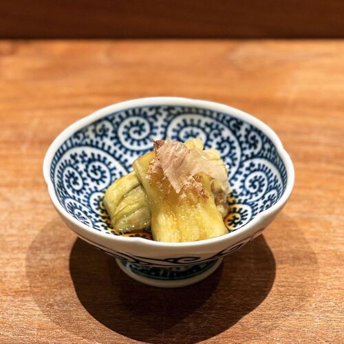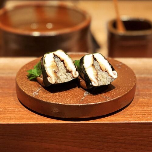 The omakase set menu provides an impressive variety, beginning with side dishes. After sashimi and bar snacks, vegetarian fare follows to change the pace and to signal the transition from snacks to nigiri. Sushi toppings showcase the chef’s craftsmanship, honed over many years, as well as a few of his novel touches. The first piece is tuna, the measure by which a sushi shop is judged. Unique choices include botan shrimp and shiitake mushrooms from Minamiuonuma. Eggs are rolled into Japanese-style omelettes, light and gentle in flavour.