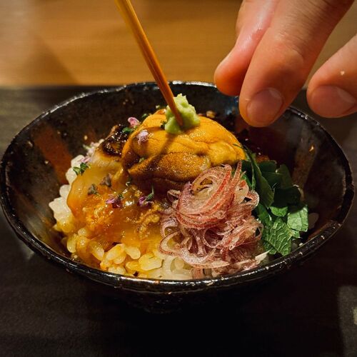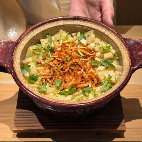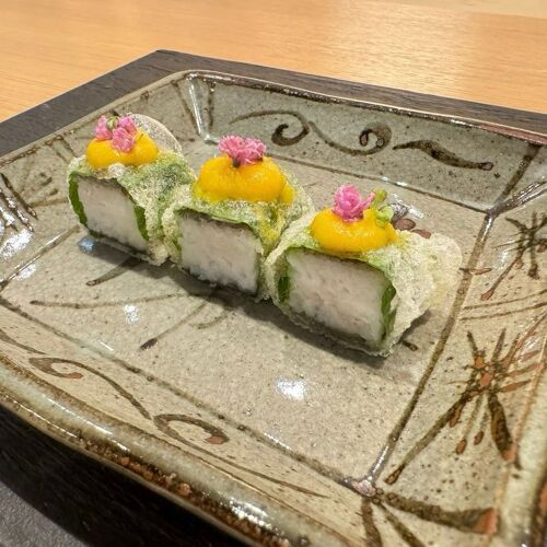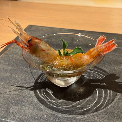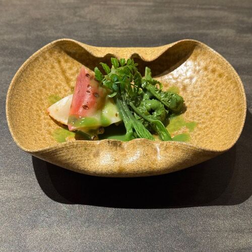What Kohei Ikeda tries to do is mix freewheeling imagination into traditional fare, an approach taught by the head of Kikunoi during his apprenticeship there. Fine examples include sea urchin wrapped in sea bream and spring rolls of glass shrimp. He focuses on ingredients from his native Ehime, the better to share its wonders with the world. Born and raised in Uwajima, Ikeda dreamed of becoming a chef in his youth. He never forgets to carry out this ‘original intention’, a phrase reflected in the name of the restaurant.