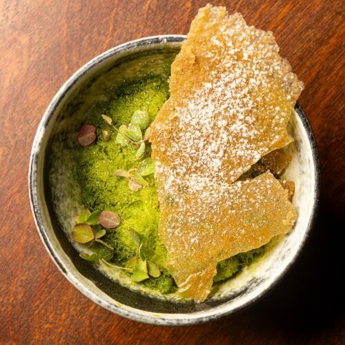 The format is tasting menu only, with options for wine and non-alcoholic pairings. Items may include a nicely seared Hokkaido scallop in a pool of watercress sauce with cubed seaweed jelly and puffed rice. Silky, soy-braised wild black cod is served in the center of a wide-rimmed bowl that is filled with a creamy buttermilk sauce that's poured tableside. Finally, wood sorrel bingsu, shaved to order, is refreshingly tart and a nice contrast to the creamy panna cotta tucked beneath.