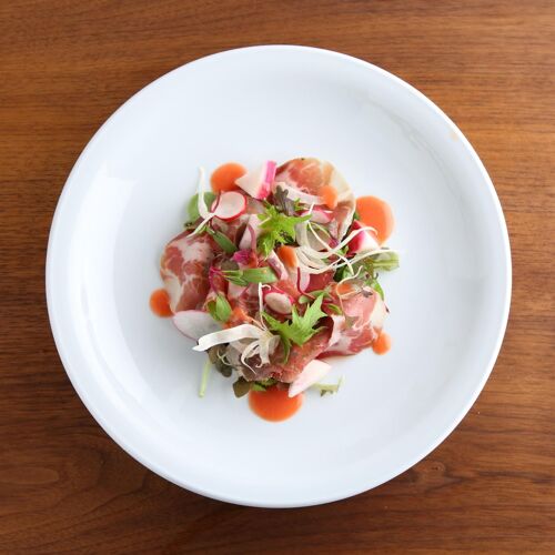 When the chef returned from Italy, he brought with him recipes rooted in the land and techniques for making pasta by hand. He now applies his experiences in Marche, a region rich in the bounty of sea and mountains, to the foodstuffs of Japan. Guests can choose from an impressive list of pasta dishes, some made with seafood and even game. The meat in the Bolognese sauce is hand-chopped, in a nod to Marchese practice. Always attentive to guests’ wishes, Maeda is happy to adjust flavours while hewing true to his cuisine’s Italian roots.