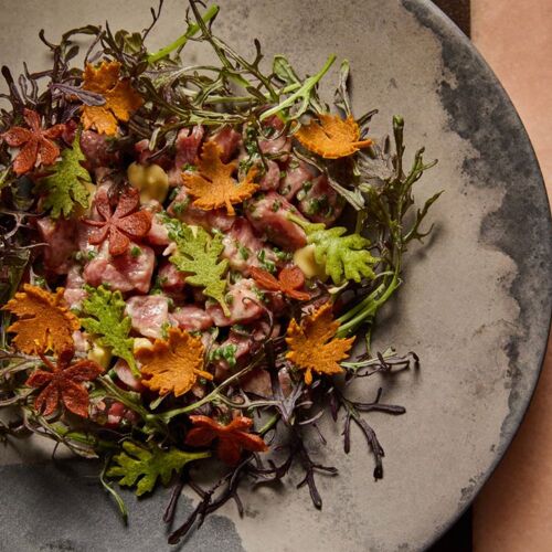 The menu is concise and stars house-made charcuterie and wood-fire grilled steaks. Watch from the chef's counter as the crew deftly cooks high quality meat, perhaps a Blackmore Wagyu New York strip, to perfection. Save room for dessert, like a round of cheesecake nestled in a mound of graham cracker crumbs and topped with a quenelle of mango lime sorbet.