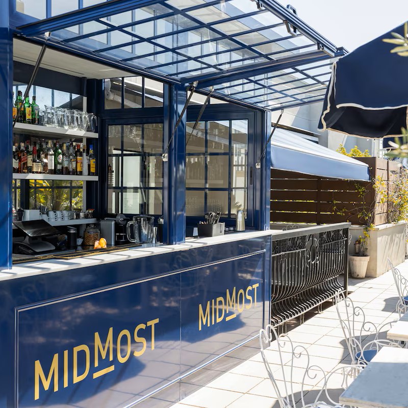 In its new incarnation it contains just 56 rooms and suites, giving each one a little bit of extra space and giving the hotel as a whole an uncrowded, unhurried atmosphere. The units are handsome in white and navy, and some come with patios, terraces, or balconies; the Suite Exclusive adds a dazzling tile floor and a freestanding bathtub right in the bedroom. And if the Midmost is light on indoor public spaces — the lobby is compact, as is the wellness room — it’s got a remarkable semi-outdoor space, the rooftop terrace, home to a plunge pool and a stylish all-day restaurant and bar.
