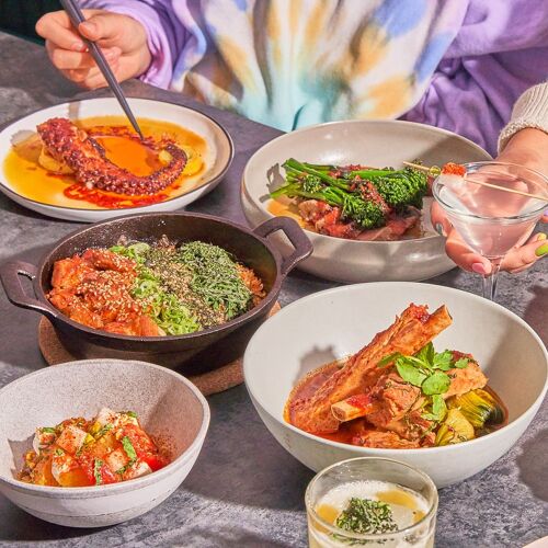 Are there any rules about showering a scoop of honey-infused vanilla cream with grated Parmesan cheese? Is there a consensus on whether an entire orb of creamy burrata goes well with rice cakes and gochujang-marinated chicken? There’s a first time for everything at this rambunctious little restaurant in the Lower East Side. The team works with a solid foundation of Korean flavors and from there, springboards into uncharted waters. Creative, bold dishes—all of which beg to be shared—run up and down this menu. Those wanting to stick to something more familiar will not leave disappointed. Littleneck clams and house-made sweet potato soojebi bathed in a savory butter and pepper-tinged broth is a satisfying start, followed by tender medallions of grilled Iberico pork galbi resting in a pool of spicy red chili paste.