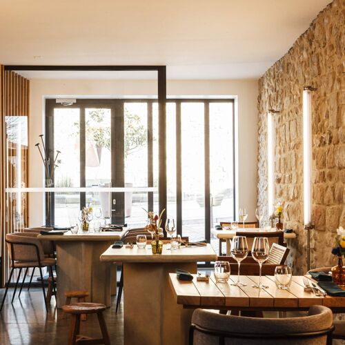 Chef-patron Maxime Szczepaniak switched from construction to cooking, teaching himself the trade during lockdown, before being hired as a chef de partie without any experience. Now he has set up shop in a listed stone house in the centre of the village. The pared-down space with exposed stone walls and waxed concrete floors also hosts exhibitions by local artists. First and foremost, however, it is the setting in which he serves his vibrant cuisine. The food centres on local produce: stuffed courgette flowers, pike-perch and asparagus, lake trout with watercress, strawberries and meadowsweet are all dishes on the reasonably priced lunch menu.