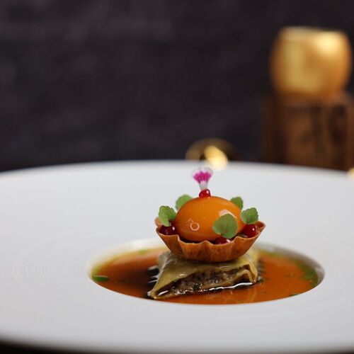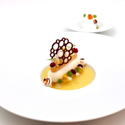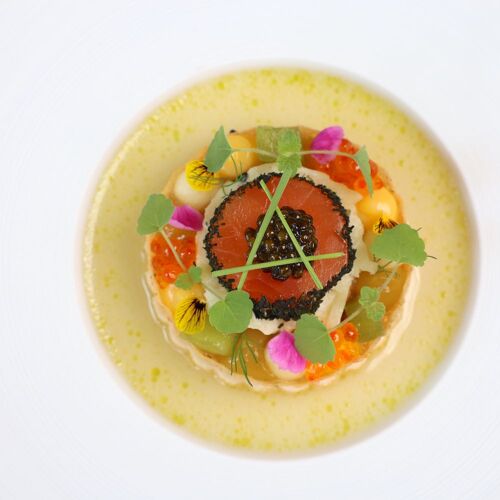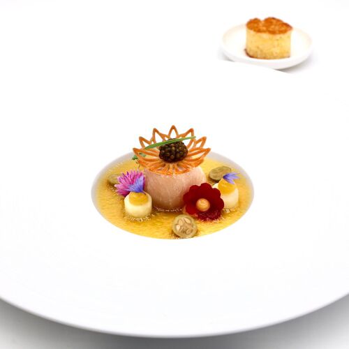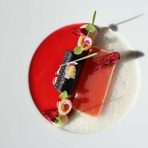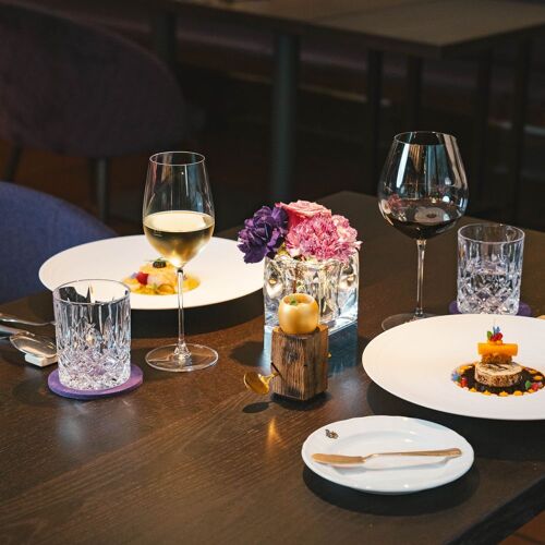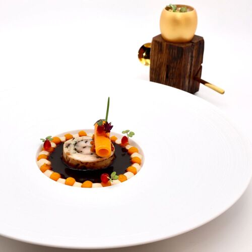 In this long-standing family business, the dedication of the Scherle brothers is plain to see. Their modern brand of cooking is strongly influenced by Japanese cuisine. The duo heading up the kitchens, Jörg Scherle and Holger Haag, create cleverly constructed and extremely precise dishes with skilfully integrated contrasts. These come into their own, for example, in the "yellowfin tuna, sakura, black cherry, celery, finger limes, ponzu, koji beurre blanc" with its delicate interplay of tuna, fruit acidity and sweetness. There are two set menus to choose from, one of which is vegetarian, each comprising five or six courses. The decor also appeals with its effective combination of modern elements and rustic details featuring beautiful old oak. From the terrace you can admire the large koi carp pool – a true koi enthusiast, Jörg Scherle even has his own koi company. Another great feature is the walk-in vaulted cellar (1870), which is home to over 1600 wines and some 200 spirits! The hotel has guestrooms ranging in style from rustic to elegant.
