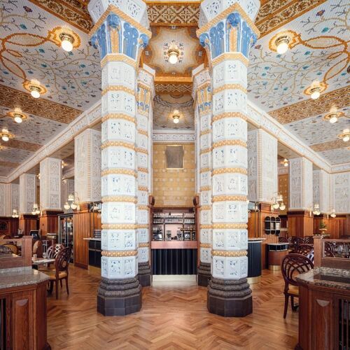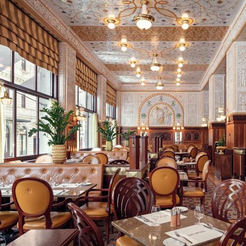 A truly magnificent setting! The restaurant of the Art Deco Imperial Hotel, a time-honoured establishment, occupies a stylish high-ceilinged room in which gorgeous historical ceramic detailing on the ceiling, walls and striking columns draws the eye. The atmosphere is lively without being hectic, and the service is well organised and professional. Featured on the classic-leaning menu is a good selection of dishes, including Czech favourites. As the place is worth seeing and attracts many guests, it's wise to book! Also open for breakfast, brunch, coffee and cake.