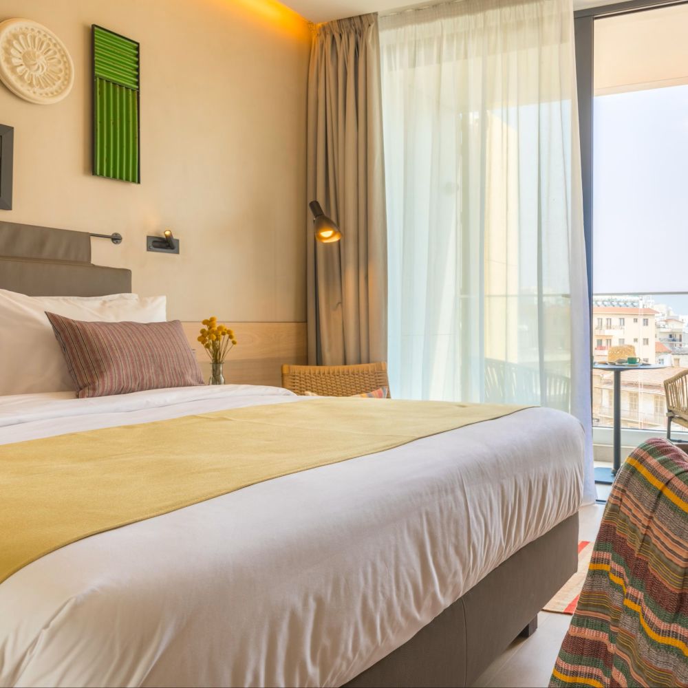 The Hotel Indigo in central Larnaca stitches together a row of old townhouses into a four-story hotel, keeping the original stone archways and vaulted ceilings intact. The lobby passes through one of these preserved arches, and rooms feature rainfall showers, balconies, vintage rotary phones. The rooftop pool looks out over the Mediterranean and the city's palm-lined promenade, which runs to Finikoudes Beach a few minutes' walk away. Oinotelia Wine Bar operates on the ground floor, pouring local and international bottles in the courtyard. The hotel is situated near the 9th-century Church of St. Lazarus and Larnaca's medieval castle, both of which are a short walk away.