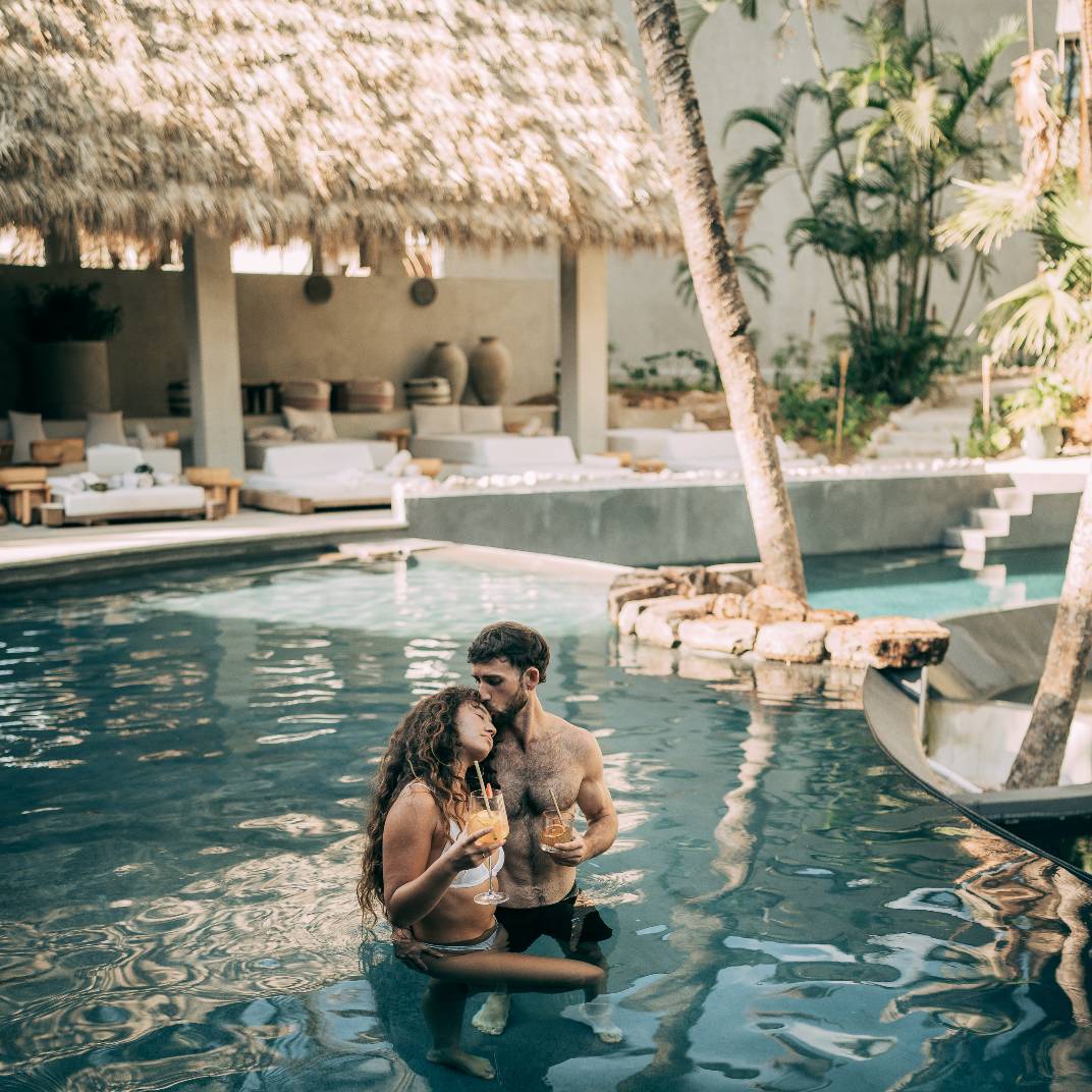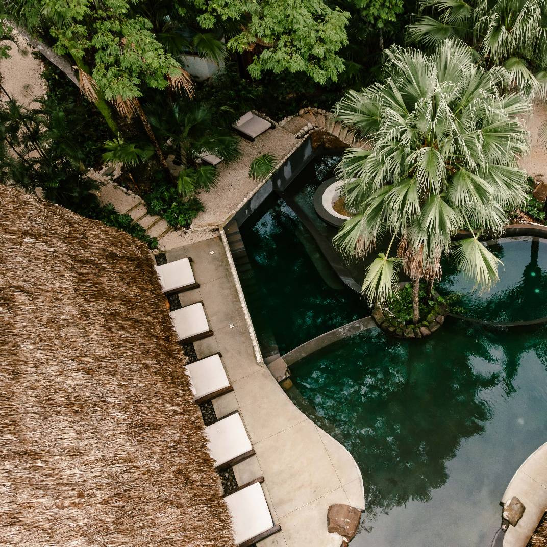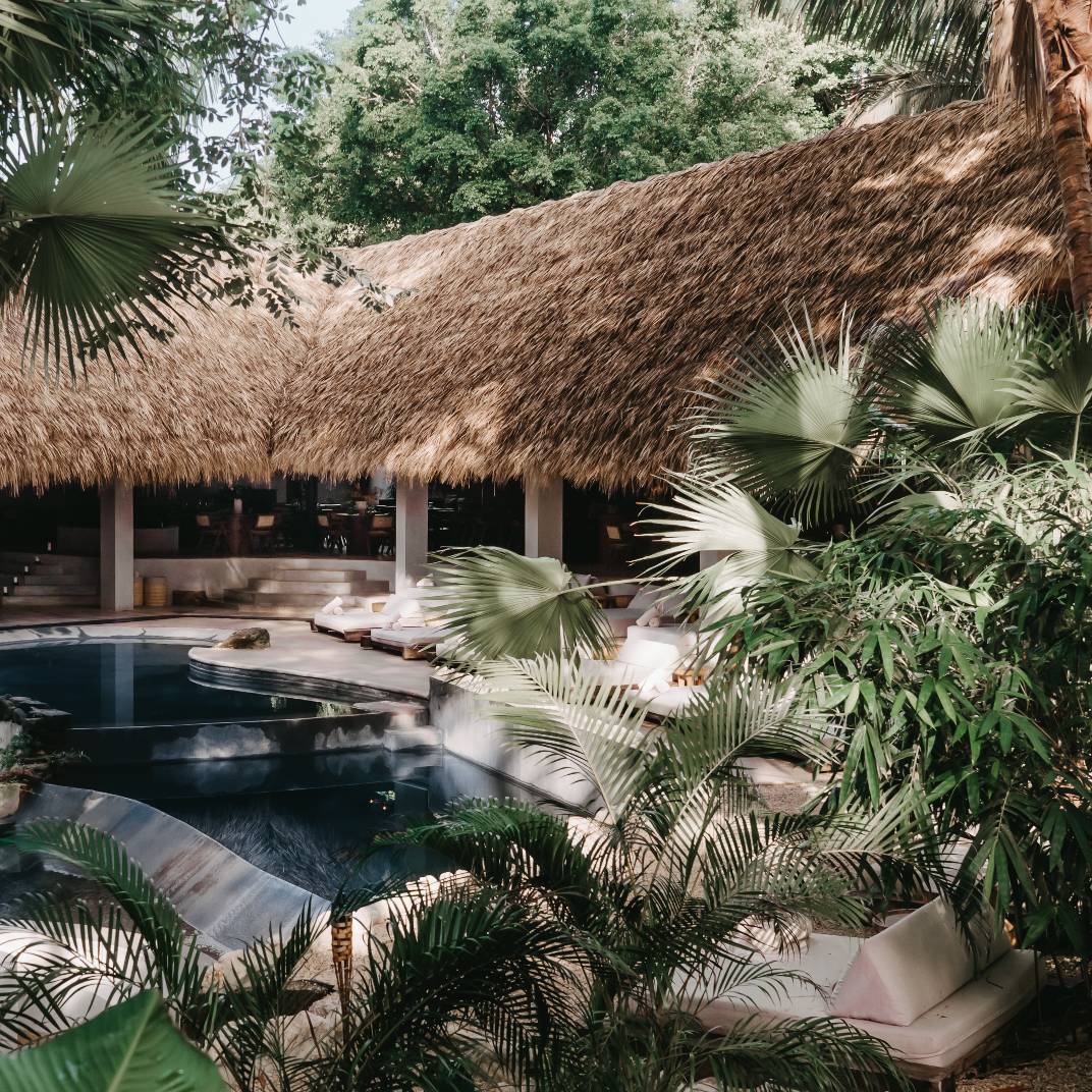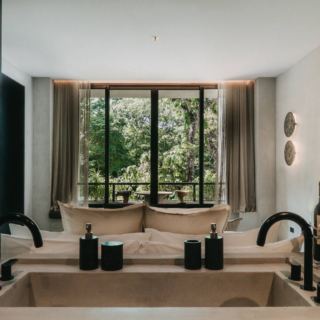 There’s a slow burn to Esh Hotel, a retreat where fire is both inspiration and ritual. Its name, drawn from the Hebrew word for flame, flickers through the design, with lava-stone soaking tubs, blackened wood furniture, and an ever-burning fireplace where guests cast their intentions. The rainforest setting is immersive, from canopy-brushing balconies to jungle baths, while the three-tiered pool invites deep unwinding. A quick shuttle ride takes you to Guiones Beach, but with charcoal margaritas and mezcal-laced sunsets waiting, you may not want to leave.