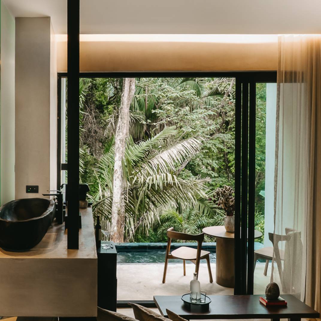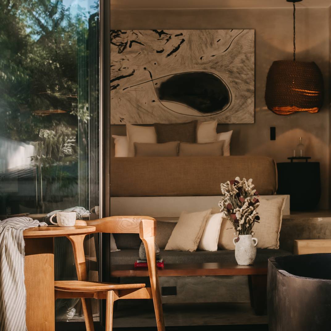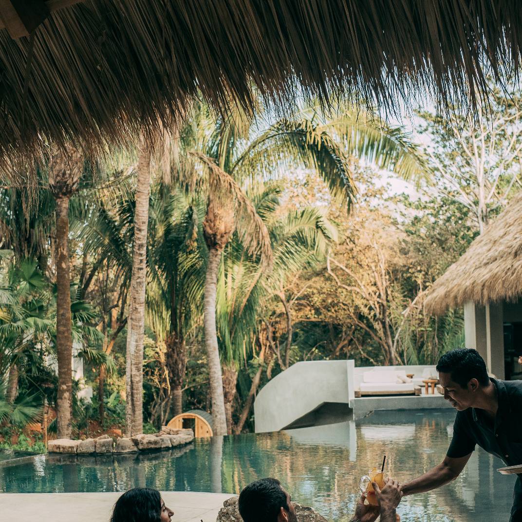 There’s a slow burn to Esh Hotel, a retreat where fire is both inspiration and ritual. Its name, drawn from the Hebrew word for flame, flickers through the design, with lava-stone soaking tubs, blackened wood furniture, and an ever-burning fireplace where guests cast their intentions. The rainforest setting is immersive, from canopy-brushing balconies to jungle baths, while the three-tiered pool invites deep unwinding. A quick shuttle ride takes you to Guiones Beach, but with charcoal margaritas and mezcal-laced sunsets waiting, you may not want to leave.