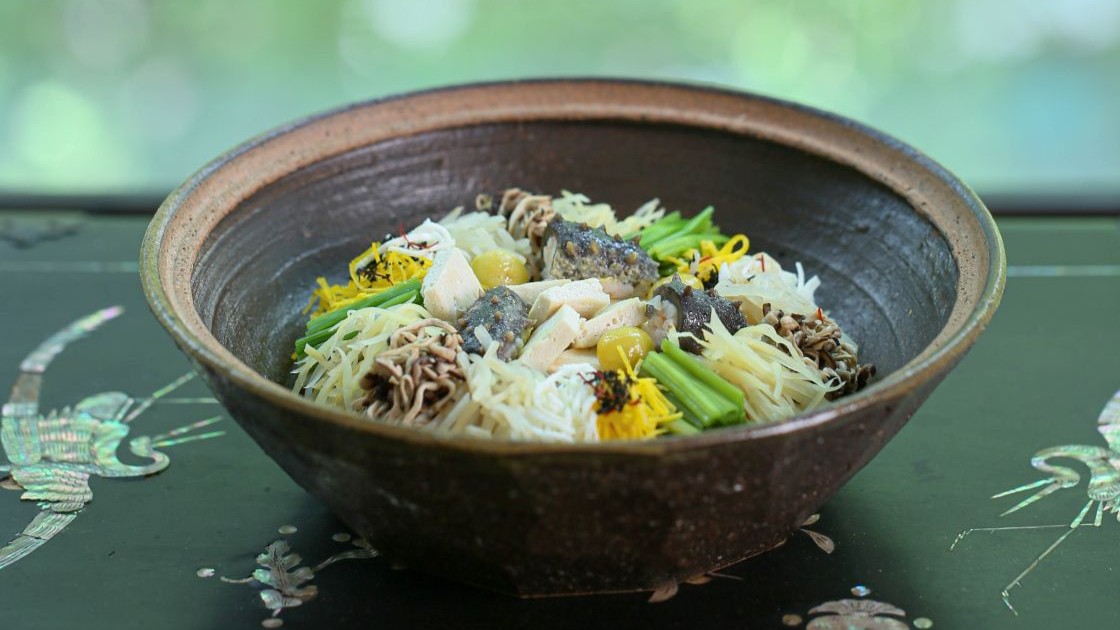 2. Tear the oyster mushrooms into thin strips, sprinkle lightly with salt, let stand briefly, then squeeze out excess moisture. Steam lightly over boiling water until tender.