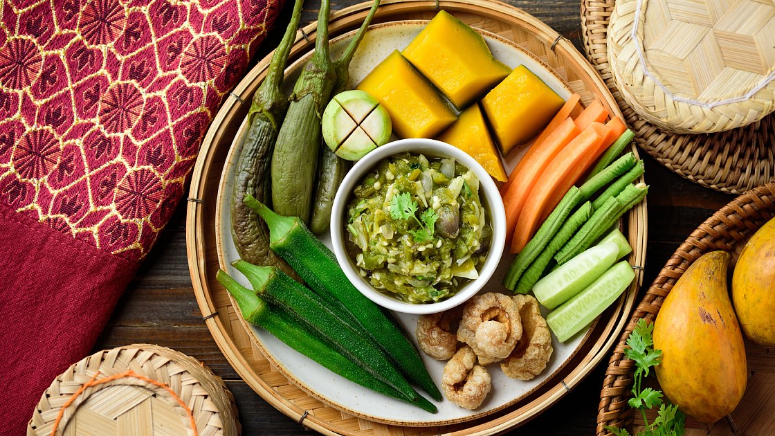 Nam phrik num hails from northern Thailand, its shades of green — from pale to deep — born from young chilies that thrive in Lanna. Long and yellowish-green, they carry a gentler heat than most. To make the dip, you only need a handful of extras: shallots, garlic and salt for depth and aroma. Some cooks add fish sauce, chopped fermented fish or grilled shrimp paste wrapped in banana leaves. Quick to prepare yet packed with flavor, nam phrik num has been a northern table staple for centuries.First, toss those green chilies and friends on the grill, then pound away until everything turns into a silky mash. Et voilà — you’ve got a dip that hits salty, sweet and just the right whisper of heat. The smoky perfume of charred chilies, shallots and garlic is enough to make anyone swoon. Nam phrik num is the ultimate all-rounder — scoop it up with crisp veggies, pair it with local favorites, or simply show it off as the North’s pride in a bowl.