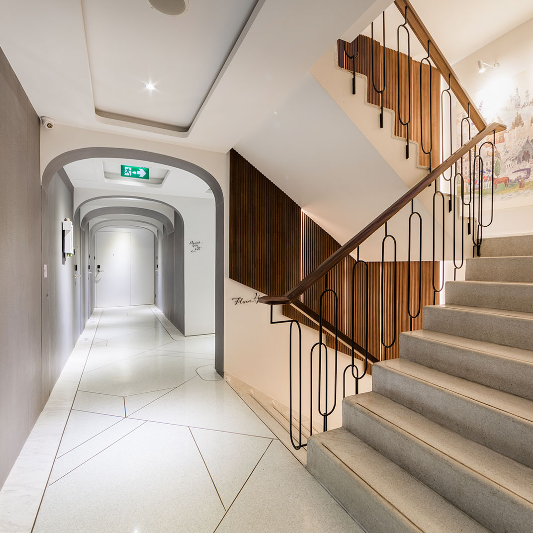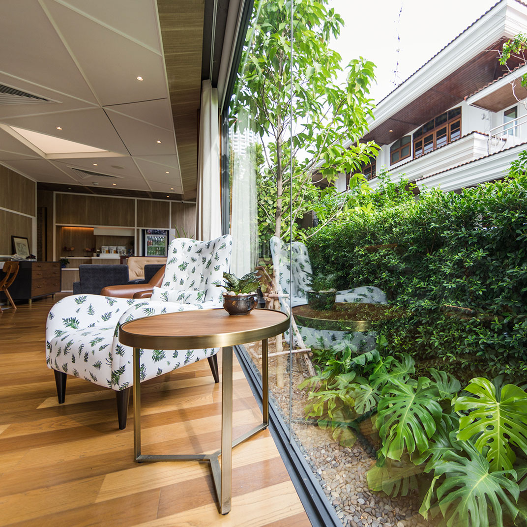 The name is short for “evolve,” so they’re conscious about changing Bangkok’s boutique-hotel game. The design is inspired by the mid-century architecture and design of the neighborhood, Thong Lor, and the hotel is furnished with period furniture, as well as modern pieces — some made from salvaged elements, like the lobby’s table, built from parts of a staircase from the house that once stood on this spot.