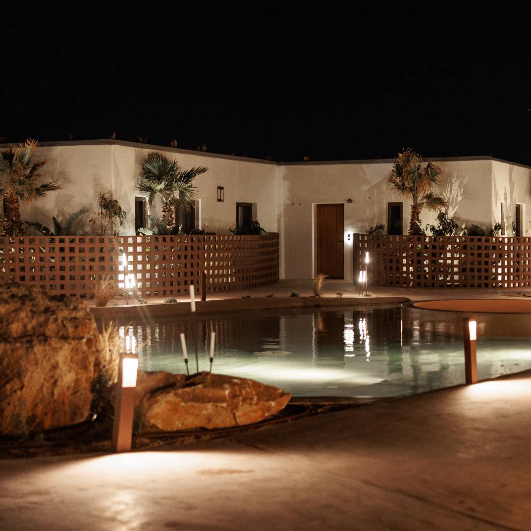 After a tour of the reserve on horseback or e-bike, the resort’s sleek cedar-lined villas and suites, outfitted in modern earth-toned decor and featuring private pools or Jacuzzis, offer sophisticated retreats from the sun. As the sun goes down, lanterns and twinkling lights illuminate the chic open-air restaurant and bistro.