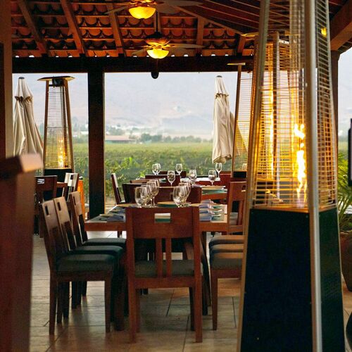 Latitud 32 is located outside of Ensenada on the Valle de Guadalupe wine route. This dining room neighbors the El Cielo resort and is set within a working vineyard, commanding a prized view of the valley's landscape. The grounds are stunning, while the restaurant has a rustic elegance with a high ceiling, stone and brick-lined walls and floor-to-ceiling glass.