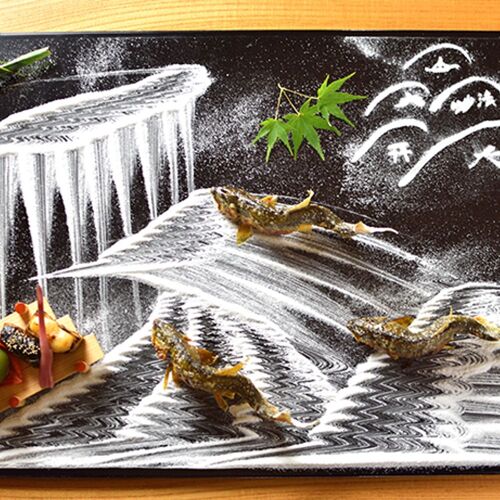 The owner-chef makes the extra effort to offer gorgeous presentations of elaborately prepared cuisine. The menu, which begins with a hassun appetiser, conveys a joyous love for the seasons. In sweetfish season, come for the rock garden platter. A clear stream and waterfall are drawn in salt on a black lacquer panel. The sweetfish on the platter is posed as if swimming upstream as mist rises from the spray of the waterfall, recalling the natural beauty of the valleys surrounding Kyoto. The scene imparts cooling thoughts as you dine.