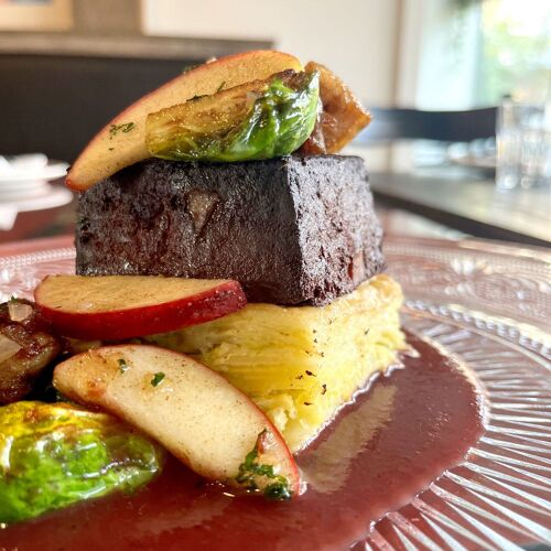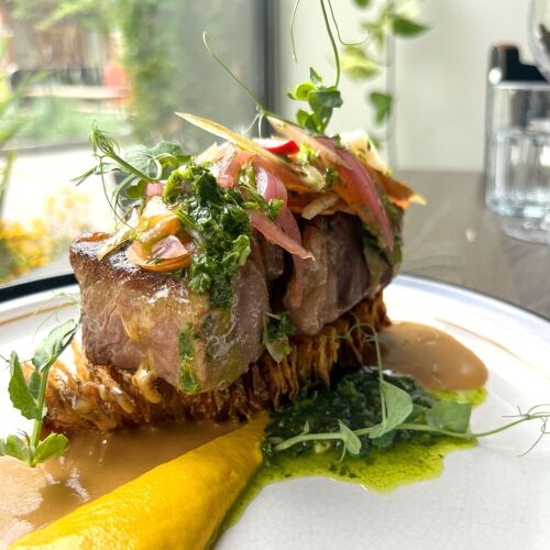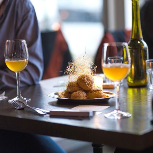 Behind a glass façade, this restaurant with a long, narrow dining space has a trendy decor. The open kitchen with a counter provides a few diners with a front-row seat to watch the chefs at work. As concise as a haiku, the tempting menu (including a standout specialty of veal sweetbreads, mushroom, and shallot) gives pride of place to local produce. This modern, seamlessly executed cuisine combines spontaneity, creativity, and precision in a festive atmosphere.
