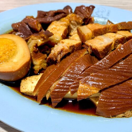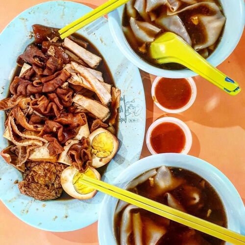 This kway chap stall serves the broad rice noodles with pork belly, trotters, intestine, tripe and dried tofu braised in a spiced soy-based marinade. Noodles are thin and silky; braised pork and tofu impart deep flavours and aromas.