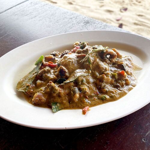 Bang Por boasts an experienced kitchen team composed of local chefs who have worked here for many years. This simple beach-front restaurant is depicted by holiday vibes and Southern Thai seafood fare. The spicy stir-fried squid with herbs is cooked in a spicy curry paste and the grilled fish is sprinkled with mixed Thai herbs. The house shrimp paste is packed with aromatic plants and coconut chili and grilled before serving, hence the pungent aroma.