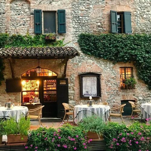 Housed in a medieval hamlet, this traditional restaurant serves typical specialities from Piacenza, as well as other dishes full of creativity and imagination. All are accompanied by wines from the region (the wine list seems to have them all! ) and elsewhere in Italy. Winter evenings are brightened by the large indoor fireplaces, while a 100 year - old wisteria provides shade in the welcoming inner courtyard in summer.