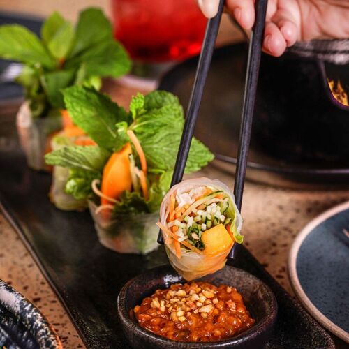 The smart wood panelled front contrasts sharply with the distressed walls, vintage lamps and hanging greenery inside. Vietnamese chefs are keen on bringing authentic Vietnamese food to Hong Kong, with chargrilled items and phở among the highlights. Try the chargrilled river prawns that boast bouncy, briny-sweet flesh and exceptional smokiness. Phở comes in generous portions with a flavour-packed soup base.