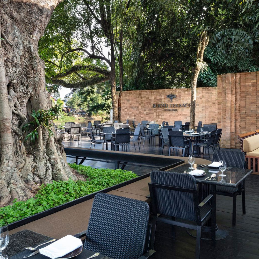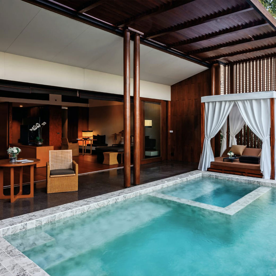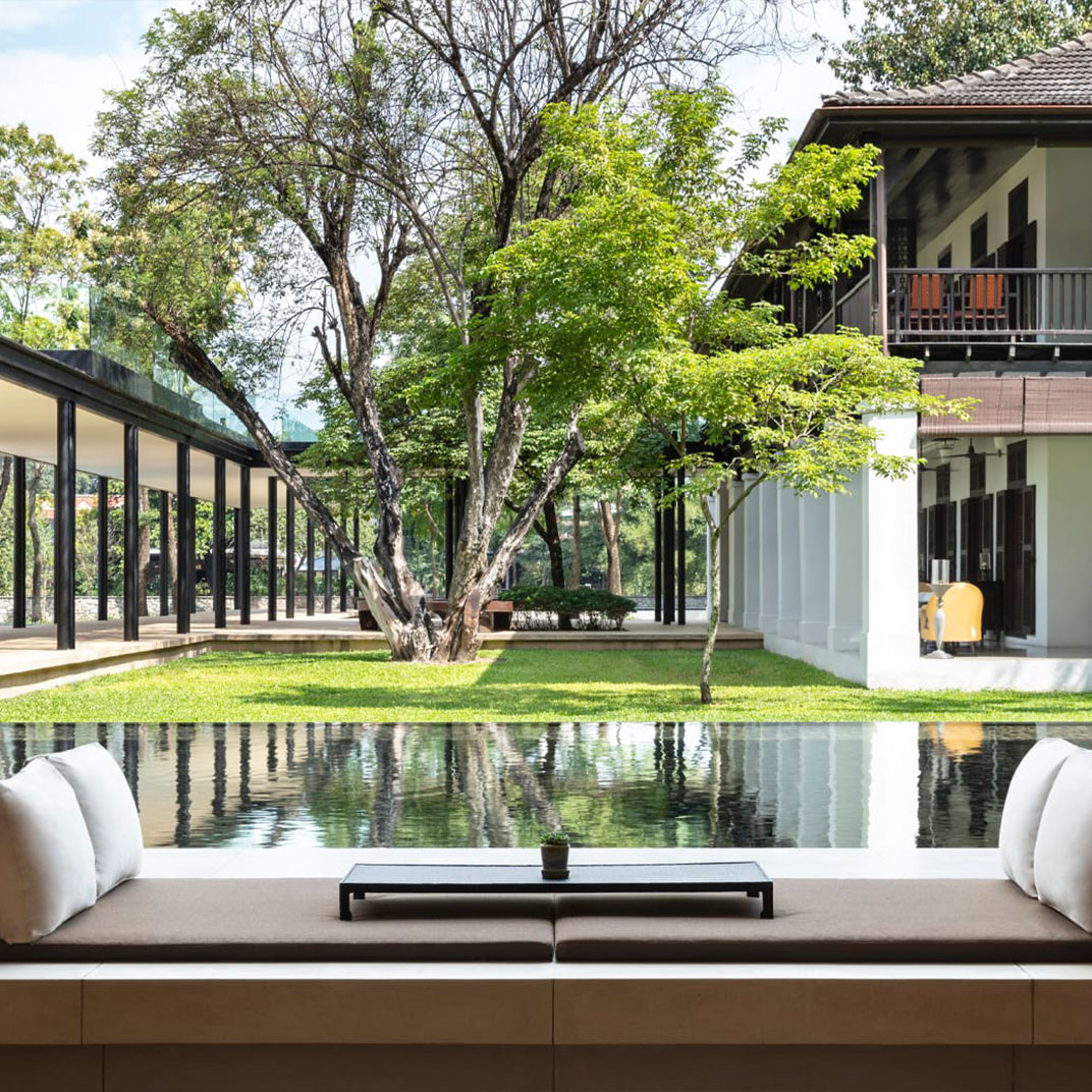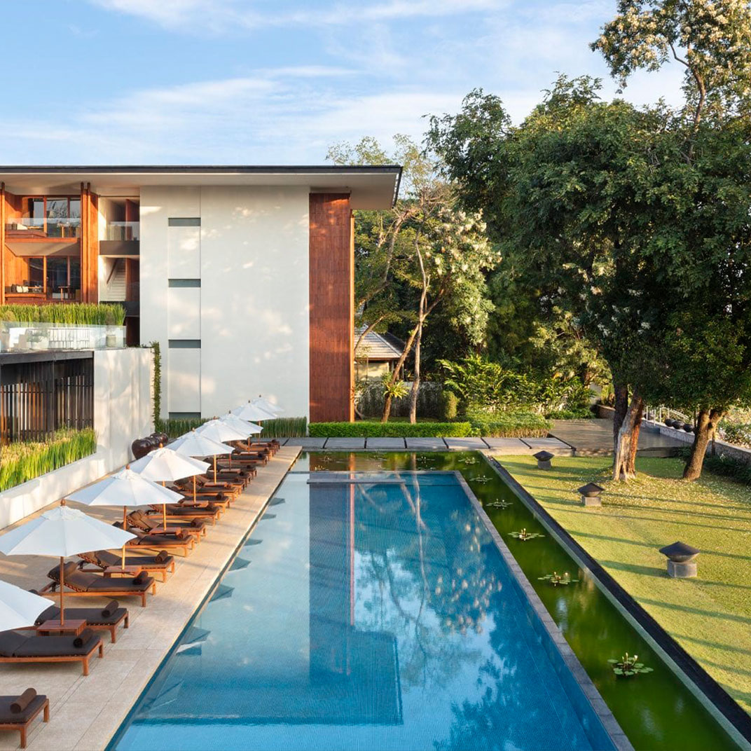 Anantara Chiang Mai Resort & Spa is built around what was once the British Consulate building: in the courtyard behind sits an open-air restaurant, and the rooms and suites stretch along the perimeter. Once past the facade of the consulate building, don’t expect a colonial look — the accommodations are modern in style, sedate and restrained in warm colors and teak and terrazzo floors. The Deluxe rooms are spacious, with sizable balconies and eye-catching red-brick bathrooms, and the Club Suites are twice as large, with indoor sitting areas, balconies with daybeds, and private butler service. All are furnished and outfitted like sophisticated urban apartments; no desert-island chic, just polished surfaces, sleek modern furnishings and flatscreens.