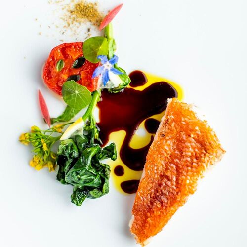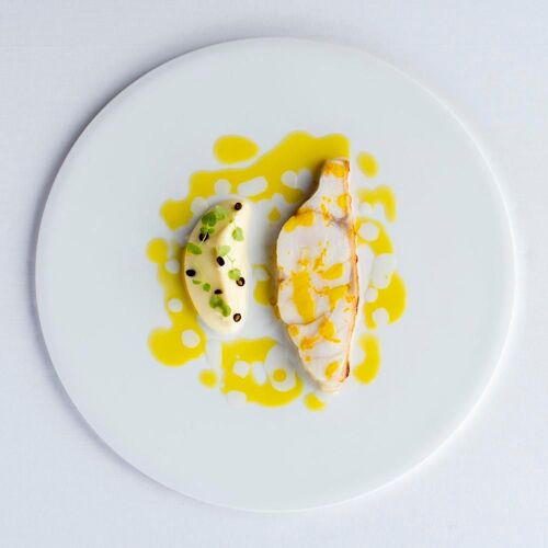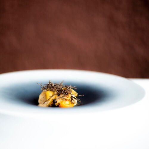 The round logo on the tabletop menu encapsulates the chef’s vision. The varying thickness of the line suggests contrasts between sharp and subtle flavours; the circle declares that the entire prix fixe menu expresses the cuisine as a whole. Sauces and cooking focus on the classic; the fascination with ingredients is a trait cultivated during the chef’s apprenticeship in France. The combination of the chef’s learned skills and passion for cuisine gives rise to a style all his own.