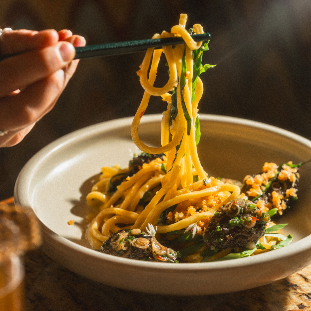 Described as the rebellious younger sibling to next-door Anh and Chi, this lively bar and restaurant offers a more freewheeling, inventive take on Vietnamese cuisine, matched with equally inspired cocktails. The compact menu comprises small plates ideal as bar snacks, like juicy binchotan-grilled skewers, or impeccably fried, crunchy frog legs anointed with torn mint and a seductive sweet-tangy sauce glaze, as well as more substantial plates like humble garlic noodles enhanced with morsels of Dungeness crab. The excitement continues into dessert, as in a layered mousse cake featuring banana, peanut and Thai chili, paired with coconut sorbet and fish sauce caramel. Whatever you do, don’t miss out on the brilliant drinks—many of which can be made spirit-free.