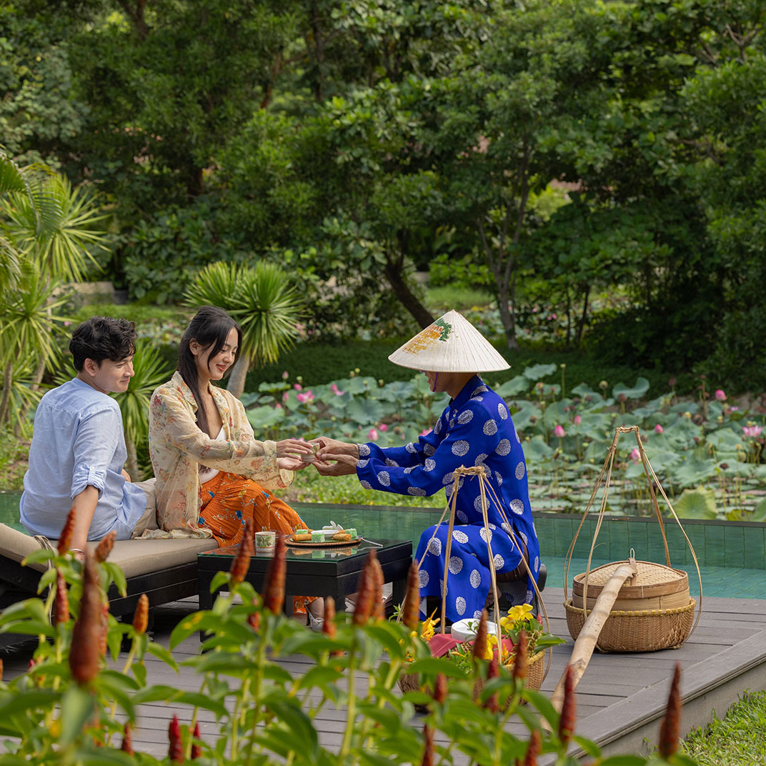 It bears underscoring: each private villa comes with its own pool. Excellent en-suite dining, cushioned sun loungers and cool, shaded pavilions make it extremely tempting to spend all day lazing around the villa in privacy. Banyan Tree has a knack for taking the best of the local design vernacular — inspired here by the elegant garden houses of Hue — and setting it atop the pillars of modern design, light and space. The result is an airy open-plan layout with one rich flourish after another — lacquer and oil painting artwork, Vietnamese calligraphy, silk embroideries, intricate latticework, artisanal ceramics, royal purple fabrics and on it goes.