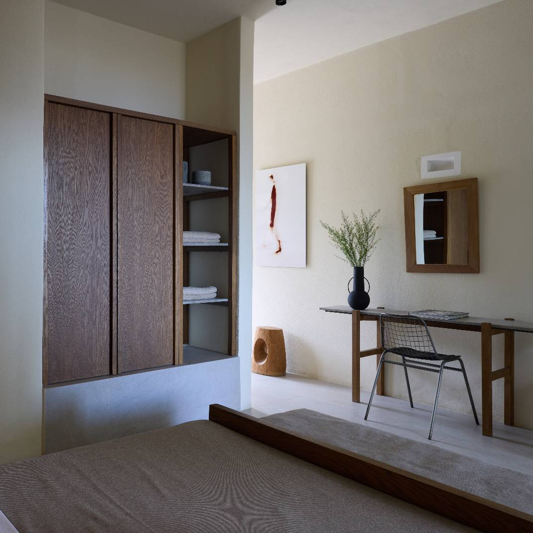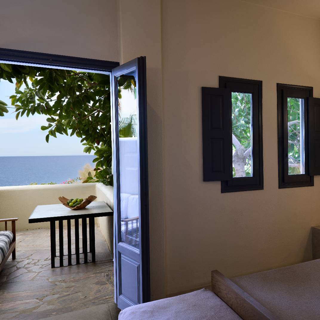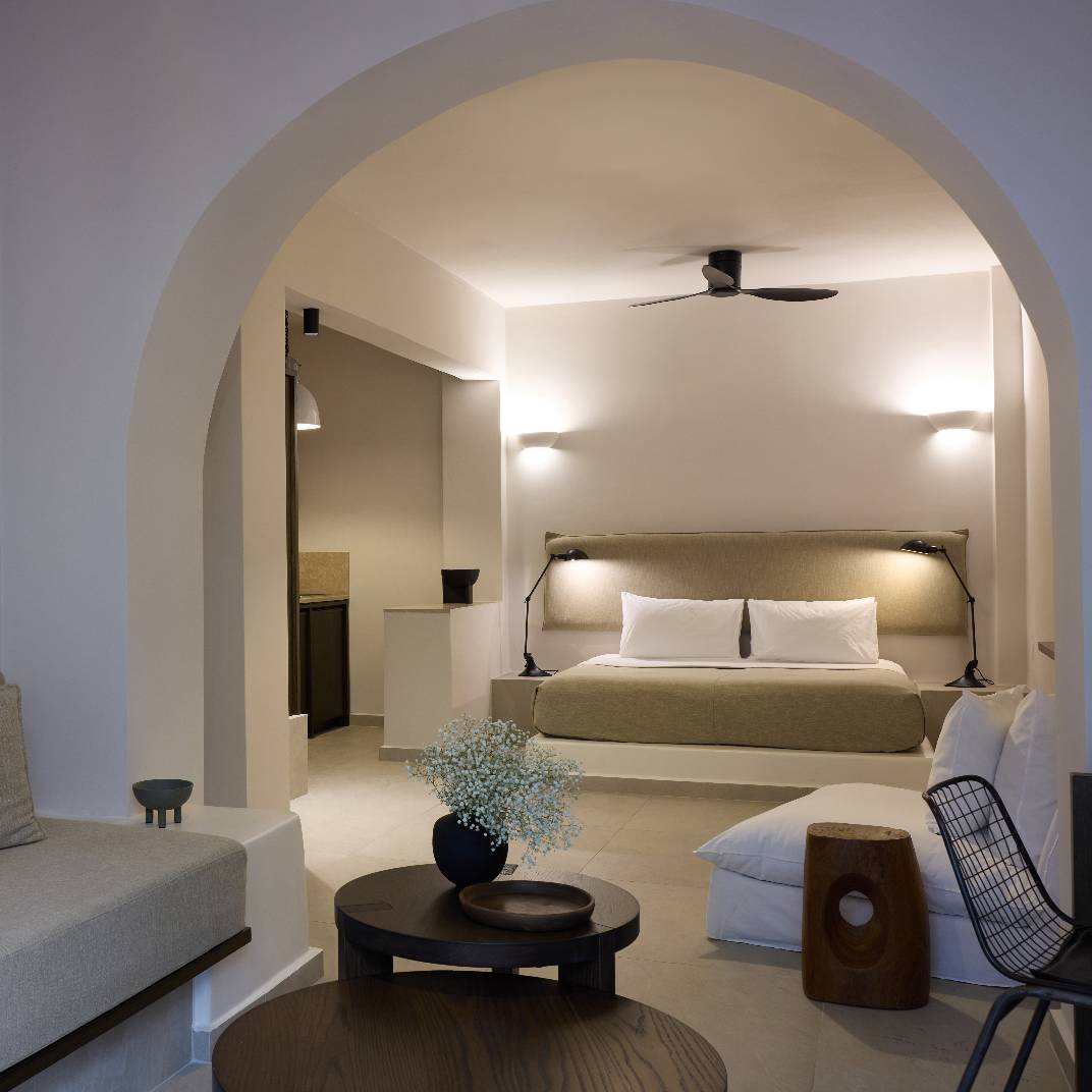 Just a few pieces here and there — a geometric painting, a quirky lamp, a coffee table made of petrified wood — add color and character to interiors that are otherwise sleek and silent. The floors are pressed cement, and the beds built-in, low to the ground and dressed with soft white linens. Marble bathrooms, stocked with organic products by Apivita. There’s a flat-screen TV and an iPod docking station, too, though you might be tempted to trade your tech-driven routine for fresh air and a couple of drinks on your private patio or terrace — whipping up coffee or tea is a snap, as each suite has a fully equipped kitchenette.