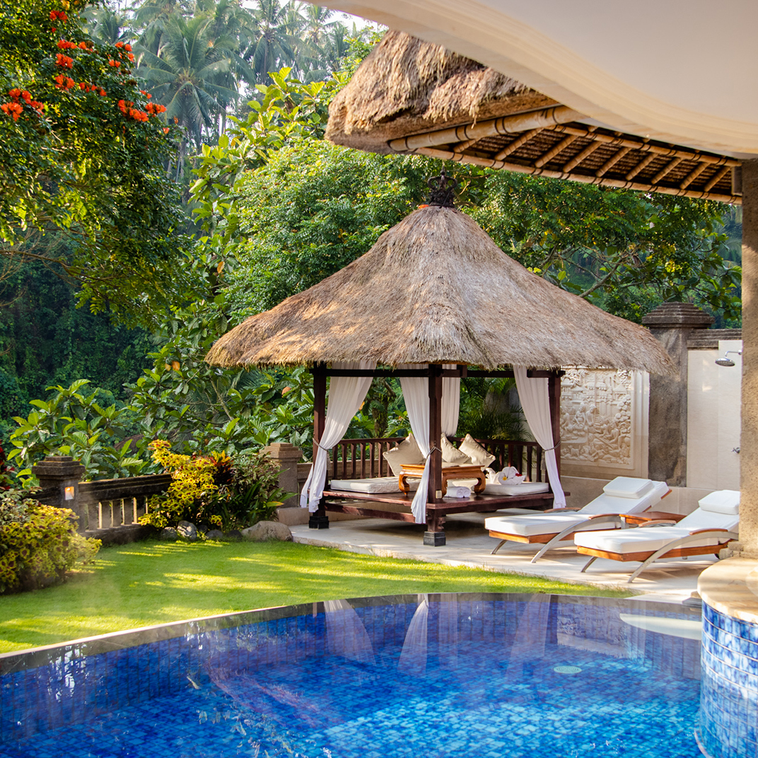 Familiar is good, when it’s well done. The style is pure contemporary-luxe Bali, clean lines and sleek surfaces with traditional furnishings and technological touches like 42” LCD televisions and DVD players. Perhaps more remarkable is the fact that each one comes with a private pool, some with infinity edges looking out into space above the valley. Garden villas have indoor-outdoor bathrooms surrounded by lush foliage, while terrace villas come with pavilions overhanging the valley edge, like outdoor living rooms, with a view.