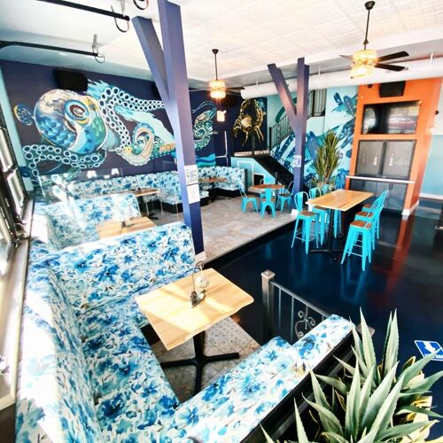 The surrounds are industrial and rather bleak, but get up close only to discover this veritable mirage of a spot. Settled on a bright corner, it is a pulsating retreat that virtually lures you in with hospitality. If that's not irresistible, the interior features a series of intriguing murals by street artist, Senkoe; aqua-blue chairs, cement floors, and a DJ booth complete the festive look.