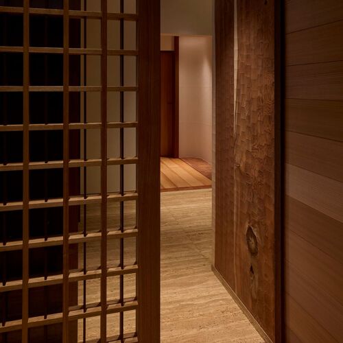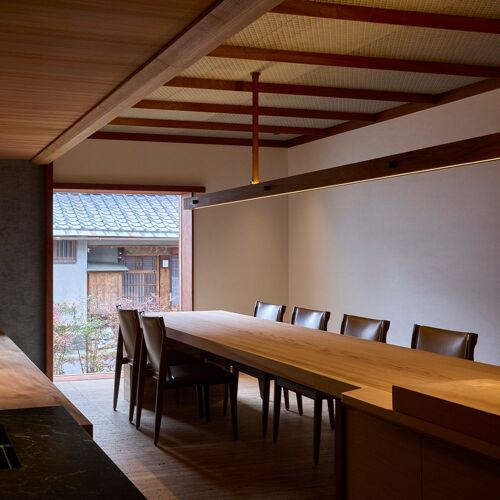 The history and culture of Nara, told through the local cuisine. The chef makes a special effort to showcase the ingredients of Gojo, the city of his birth. Vegetables gathered each morning bring freshness and vibrancy to the menu; Hinohikari rice is used to make iimushi or steamed mochi rice with seasonal toppings, and takikomi-gohan, or mixed rice. The dishes, hot and fragrant, are served over a counter of Yoshino cedar. The chef enthusiastically shares the stories behind his creations, to ensure diners get a feeling for the landscape where their food comes from, and the people who grew or raised it.