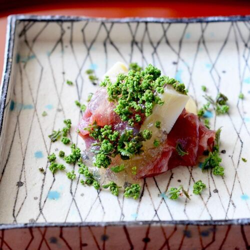 The look of the establishment is a ‘modern-day tearoom’, with concrete walls and glass-enclosed kitchen. The operation is run by the proprietor and the sommelier, both of whom have experience working in Japanese restaurants in Paris. From the proprietor’s native Tokushima come supplies of seafood, citrus fruits and rice. Another Tokushima influence is the use of Awa bancha, a fermented tea. Nogizaka Shin hosts tasting events every month, featuring discussions about pairings with wines and Japanese sake. The teamwork between chef and sommelier points to the future of kappo.