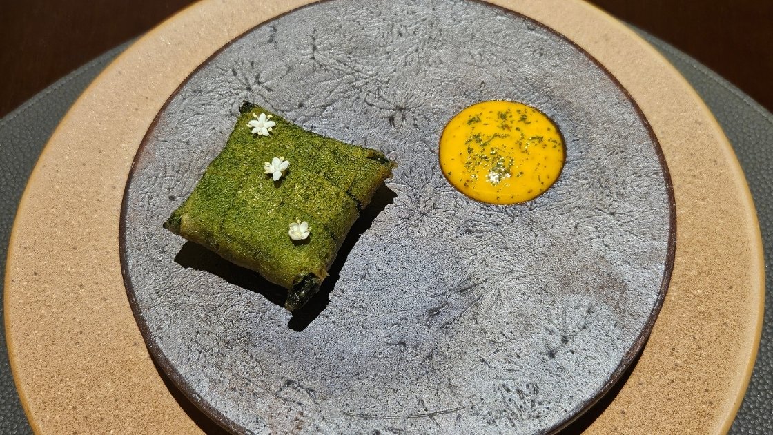 The presentation is unique with very meticulous handwork. The outer pastry sheet is neatly laid out and offers a crispy texture. On the inside, the betel leaf is intact and rich in herbal flavor. Local silver catfish is used as the filling, which is not only tender but also juicy with a fresh and sweet fish flavor. The temperature is also perfectly controlled. The accompanying sauce is a rendang fish emulsion. The umami flavor of the fish, along with spices such as galangal, turmeric, and chili, and the sweetness of coconut milk, are perfectly balanced."