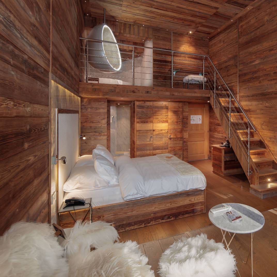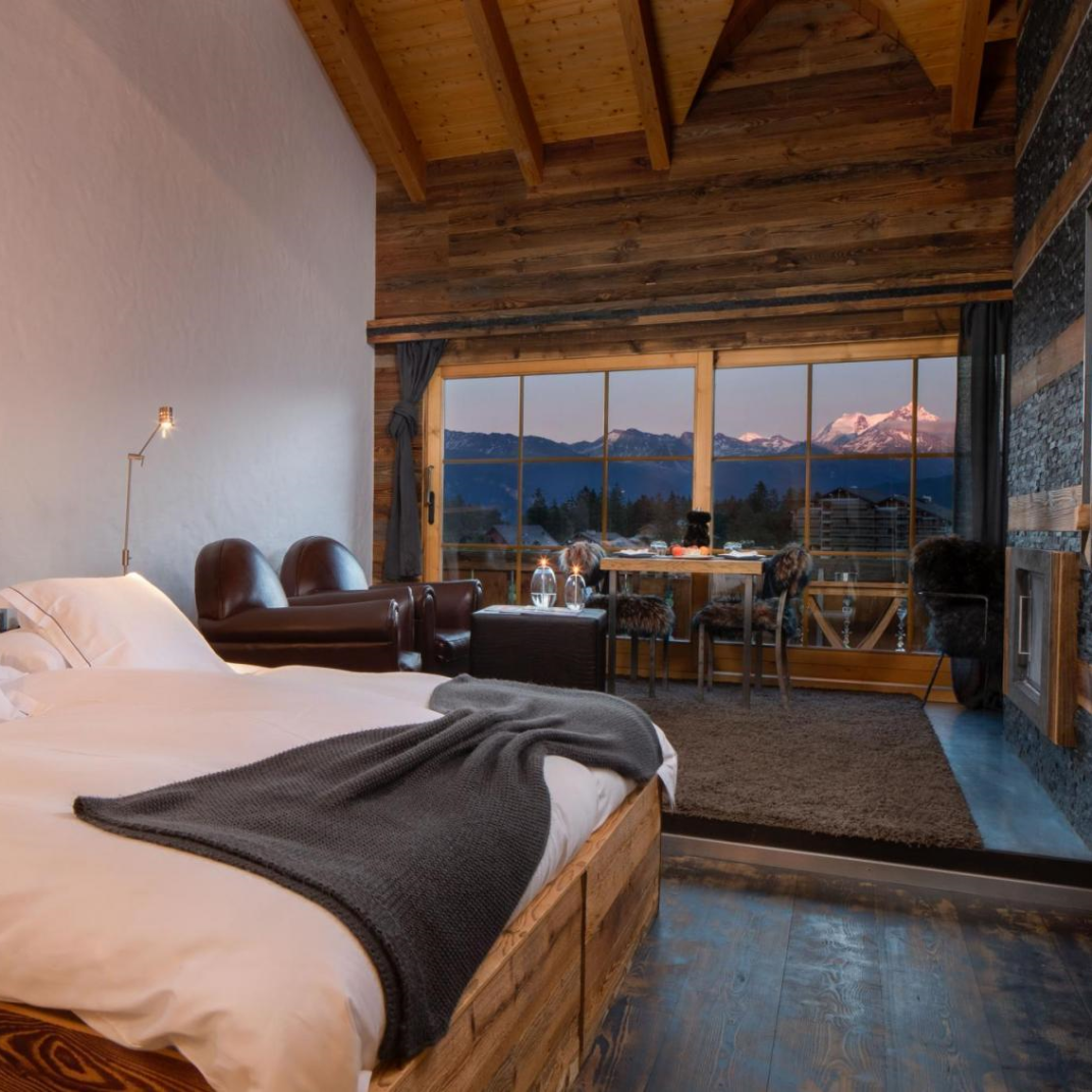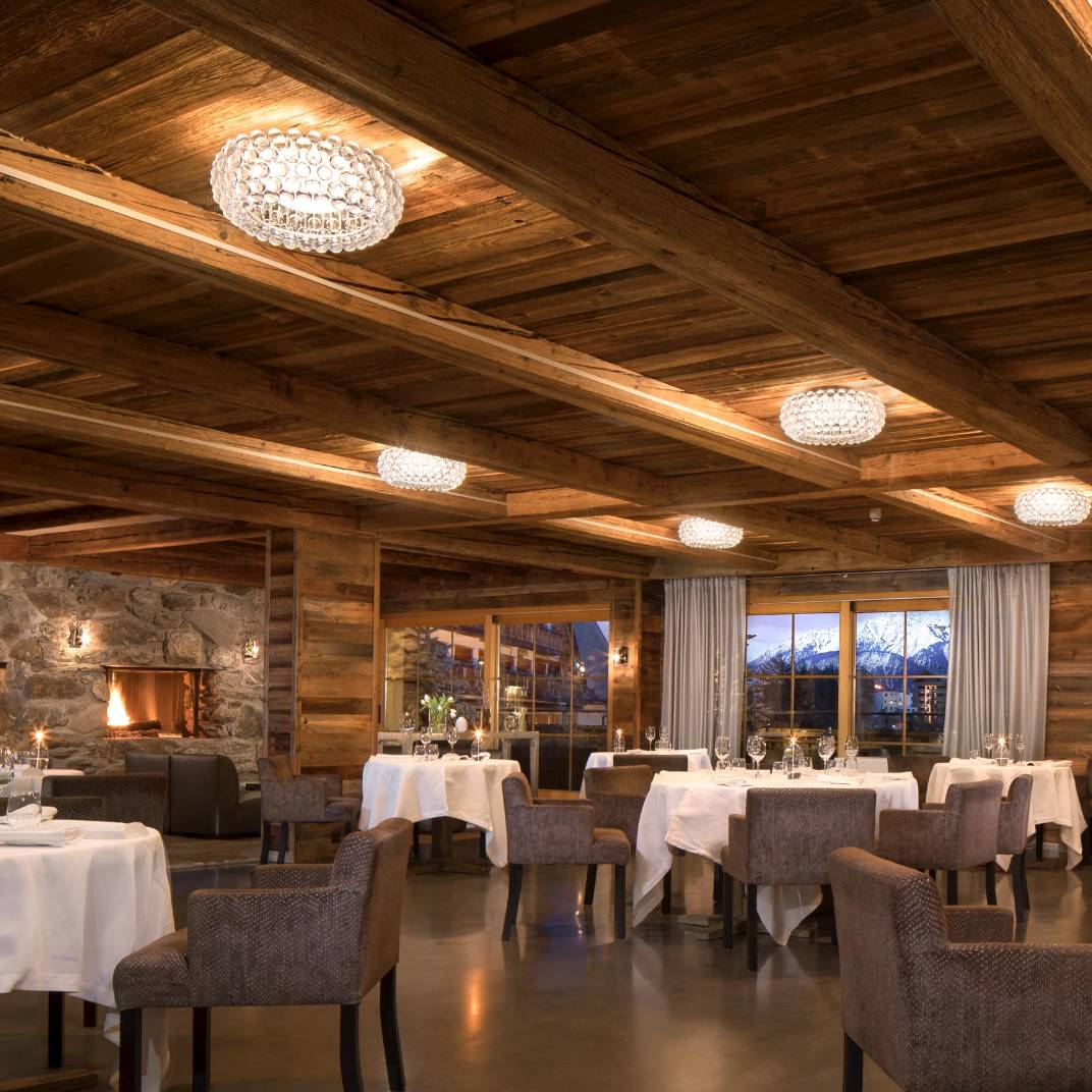 At first glance the Hostellerie du Pas de l’Ours could hardly look more traditional, its weathered, rough-hewn wooden structure standing atop even rougher stone foundations. Inside, however, it’s a different story, its wood-paneled weightiness lightened by crisp contemporary design and high-tech modern comforts. The L’Alpage Spa offers the full complement of restorative treatments, including an indoor pool that, weather permitting, opens to the Alpine air. And two restaurants serve the Hostellerie’s guests: the Michelin-starred fine-dining L’Ours and the more rustic Bistrot des Ours, both under the direction of chef Franck Reynaud.